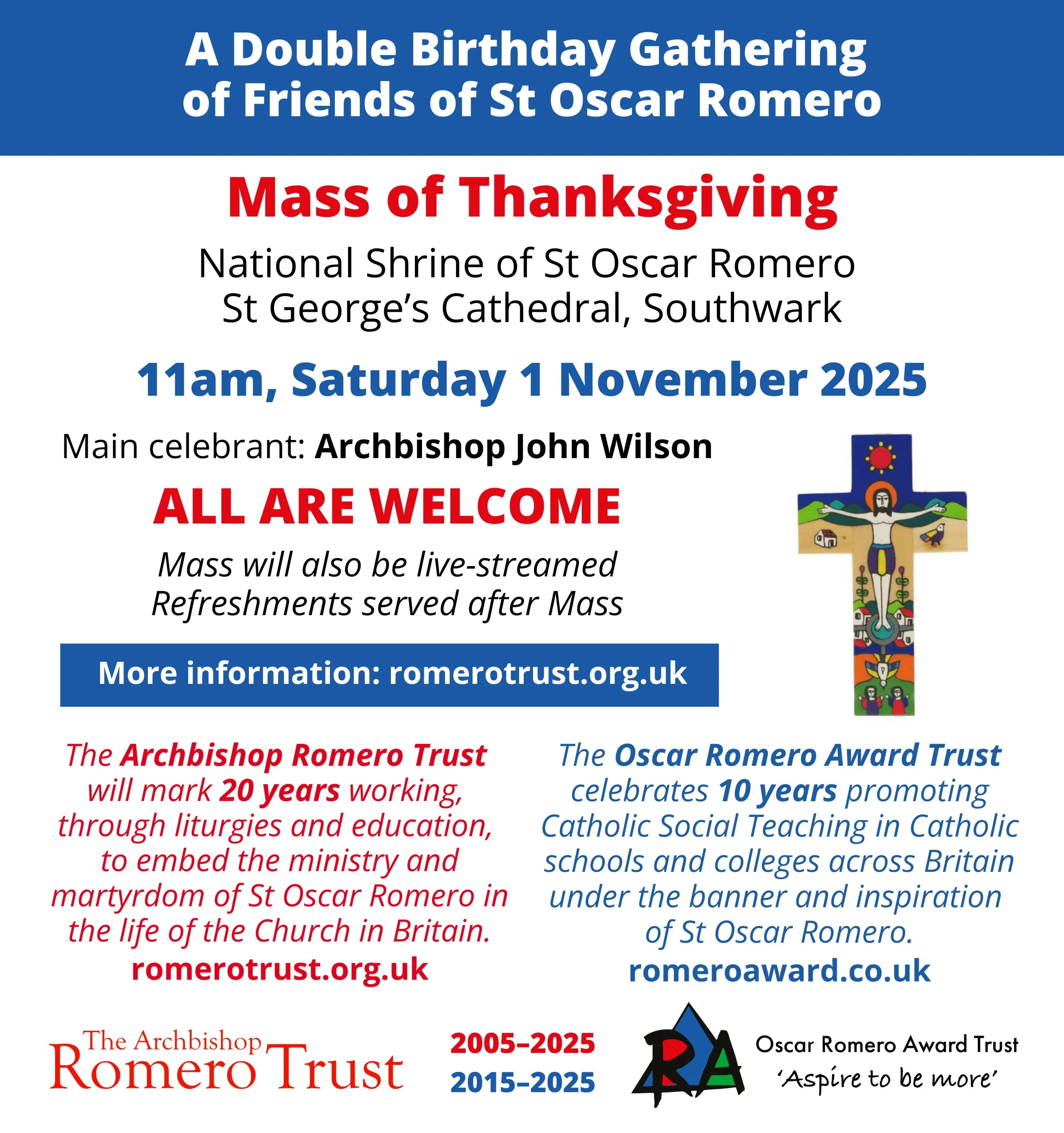 This year, 2025, marks 20 years of the work of the Archbishop Romero Trust and 10 years since the creation of the Oscar Romero Award Trust for schools. To celebrate, the Mass of Thanksgiving will be celebrated by Archbishop John Wilson at St George’s Cathedral, Southwark, the national shrine to Saint Oscar Romero.